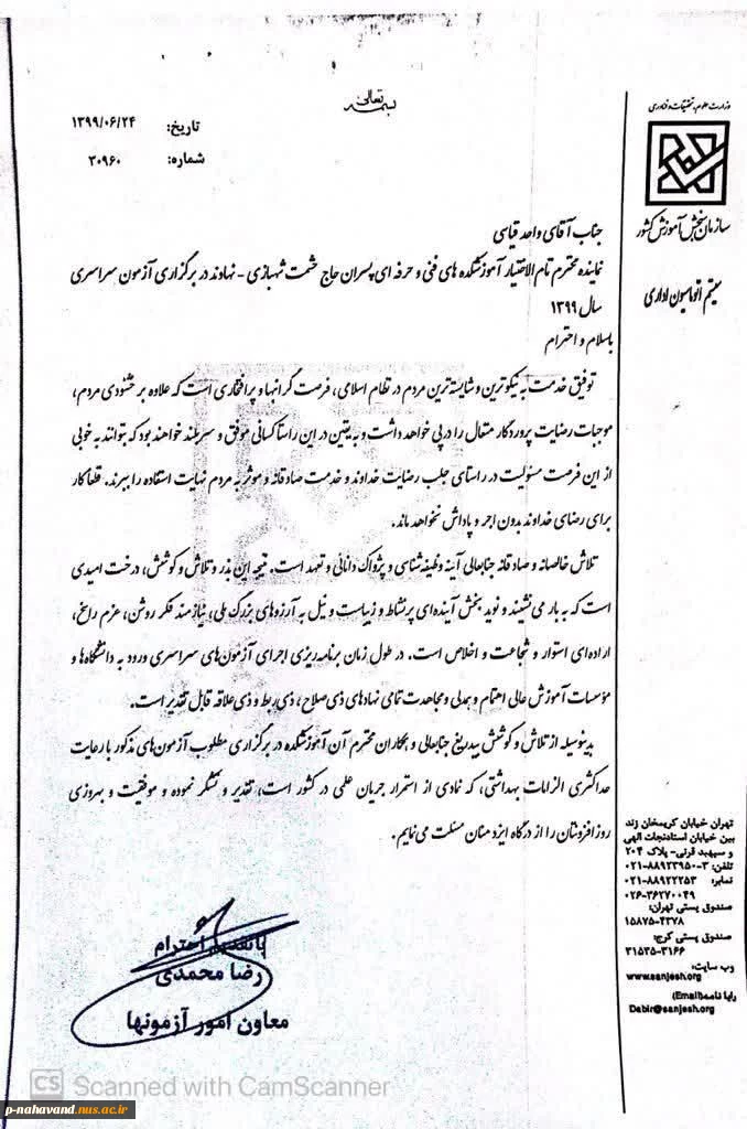 امتیاز دهید : تقدیر معاون آزمونهای سازمان سنجش از ریاست وعوامل اجرایی کنکور ارشد ، سراسری و فنی وحرفه ای دانشکده (فنی حاج حشمت شهبازی )نهاوند 2 دوشنبه 31 شهریور 1399 ساعت 9:29