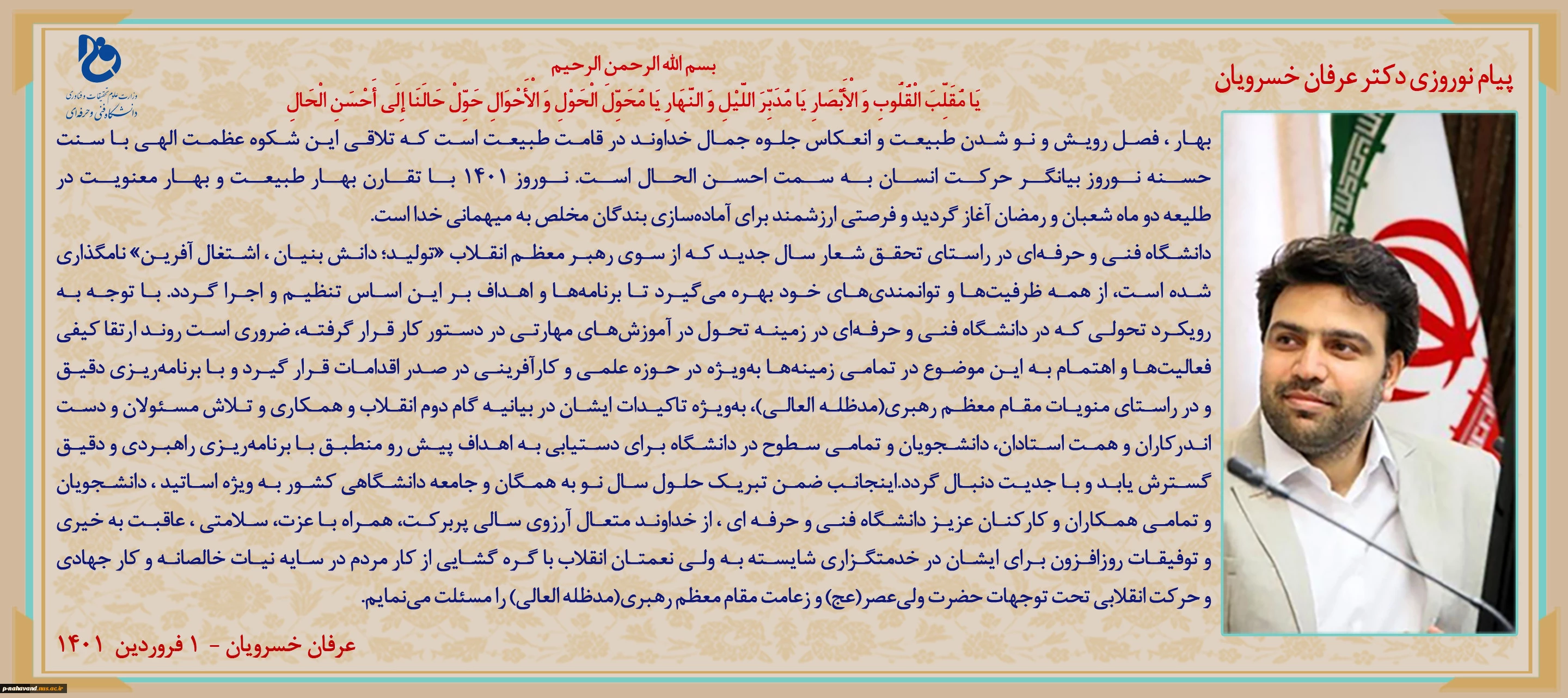 امتیاز دهید : پیام نوروزی دکتر عرفان خسرویان به خانواده بزرگ دانشگاه فنی و حرفهای به مناسبت آغاز سال 1401 شمسی 2 دوشنبه 1 فروردین 1401 ساعت 7:15