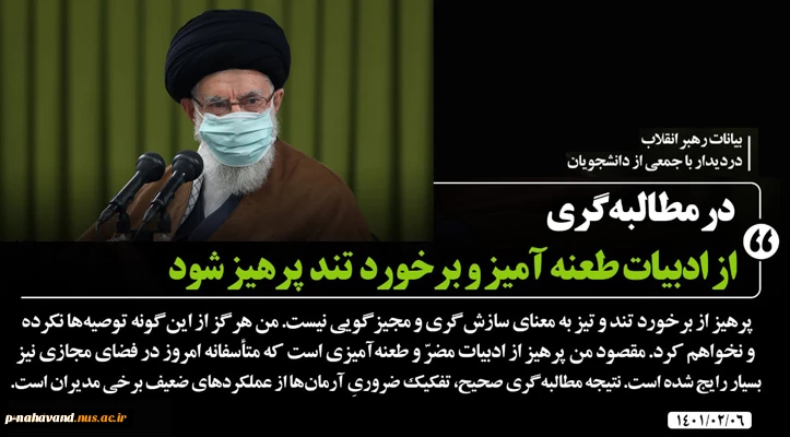 امتیاز دهید : بیانات رهبر معظم انقلاب اسلامی در دیدار جمعی از دانشجویان و تشکل های دانشجویی - [۶ اردیبهشت ۱۴۰۱] 2 چهارشنبه 14 اردیبهشت 1401 ساعت 1:52