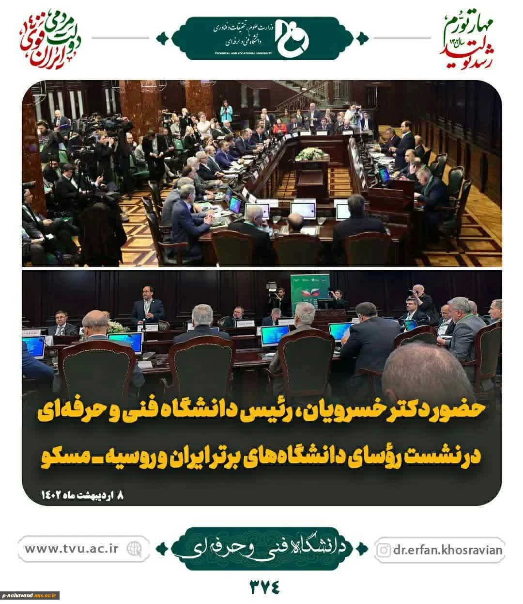 امتیاز دهید : درآستانه هفته آموزش حضور ریاست محترم دانشگاه فنی و حرفه ای در نشست روسای دانشگاه های برتر ایران و روسیه، گرامی می داریم. 2 شنبه 9 اردیبهشت 1402 ساعت 0:20