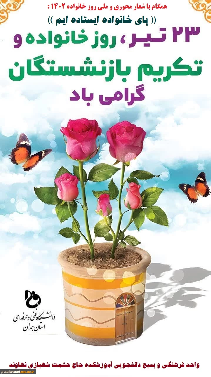 امتیاز دهید : بیست و سوم تیر ماه روز خانواده و تکریم بازنشسنگان گرامی باد. 2 جمعه 23 تیر 1402 ساعت 20:04