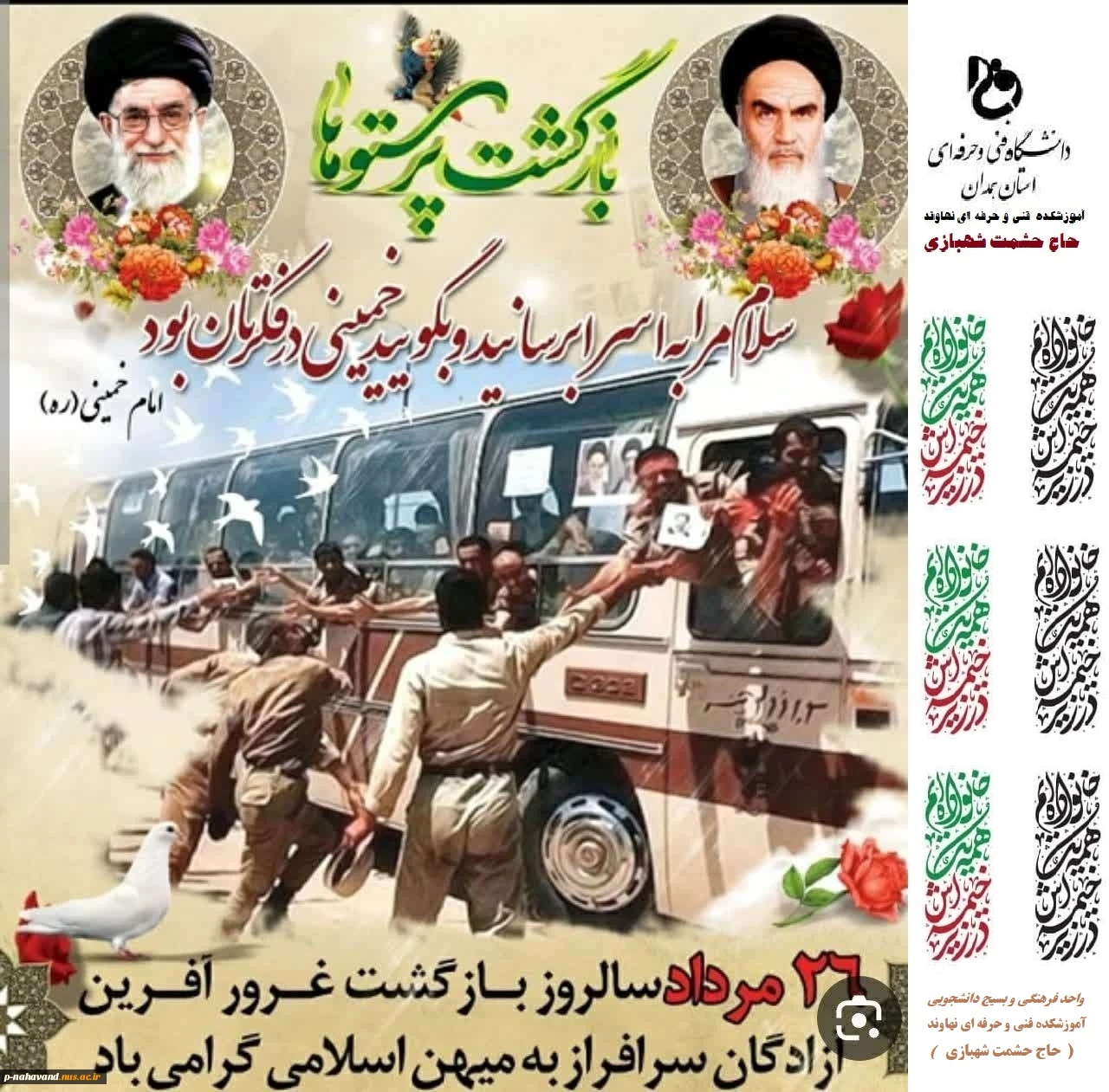 امتیاز دهید : سالروز بازگشت افتخار آمیز آزادگان سرافراز به وطن عزیزمان گرامی باد. 2 پنجشنبه 26 مرداد 1402 ساعت 14:44