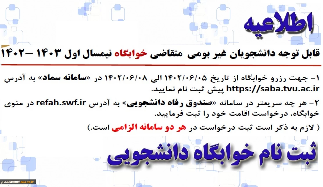 اطلاعیه ثبت نام خوابگاه دانشجویی 2