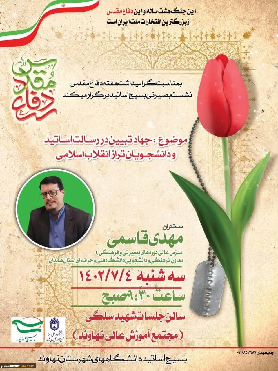 برگزاری جلسه گرامیداشت هفته دفاع مقدس دانشگاهیان نهاوند با سخنرانی جناب آقای مهدی قاسمی (مدرس عالی دوره های فرهنگی و بصیرتی؛معاون فرهنگی دانشجویی دانشگاه فنی و حرفه ای استان همدان) 2