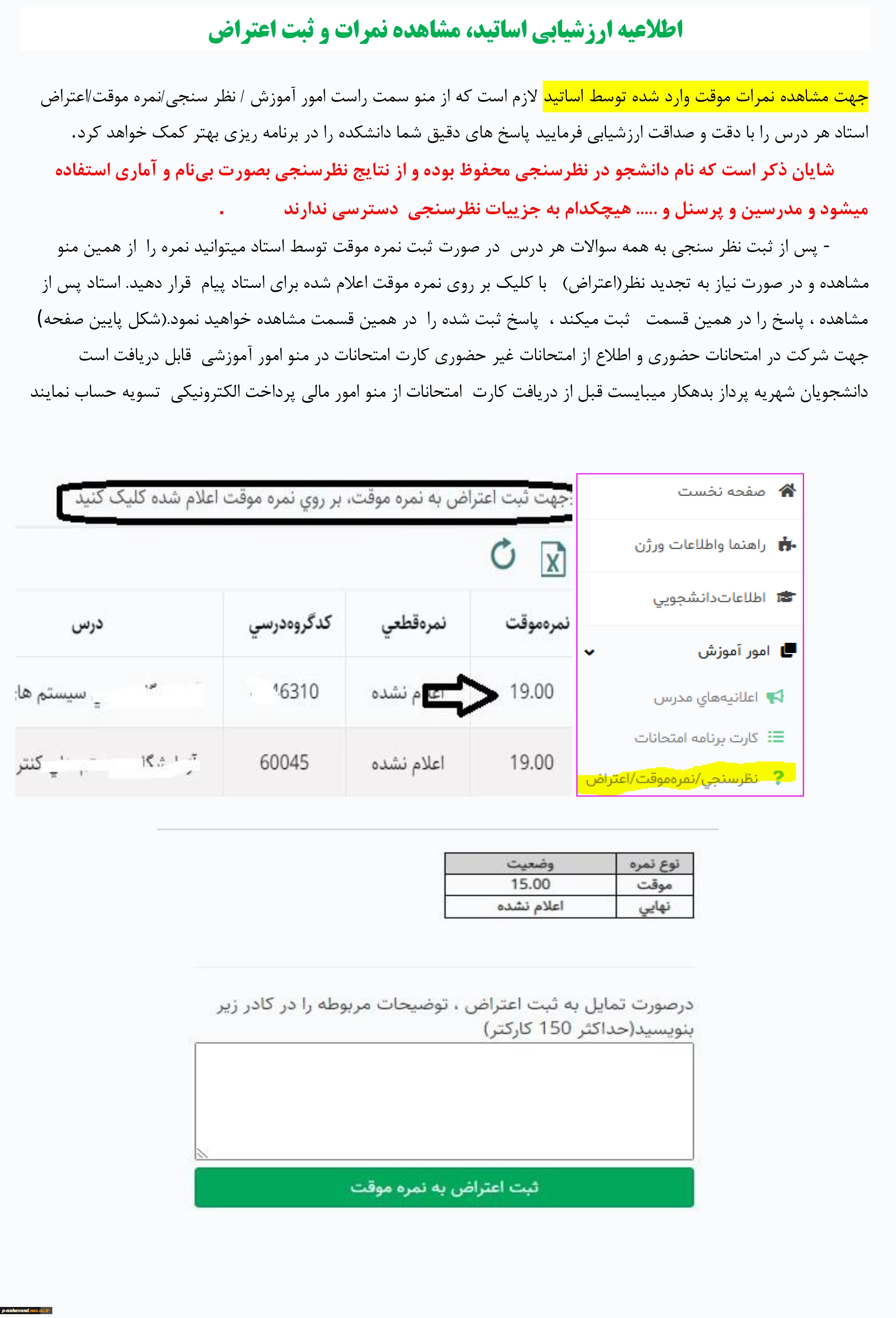 اطلاعیه ارزشیابی اساتید، مشاهده نمرات و ثبت اعتراض 3