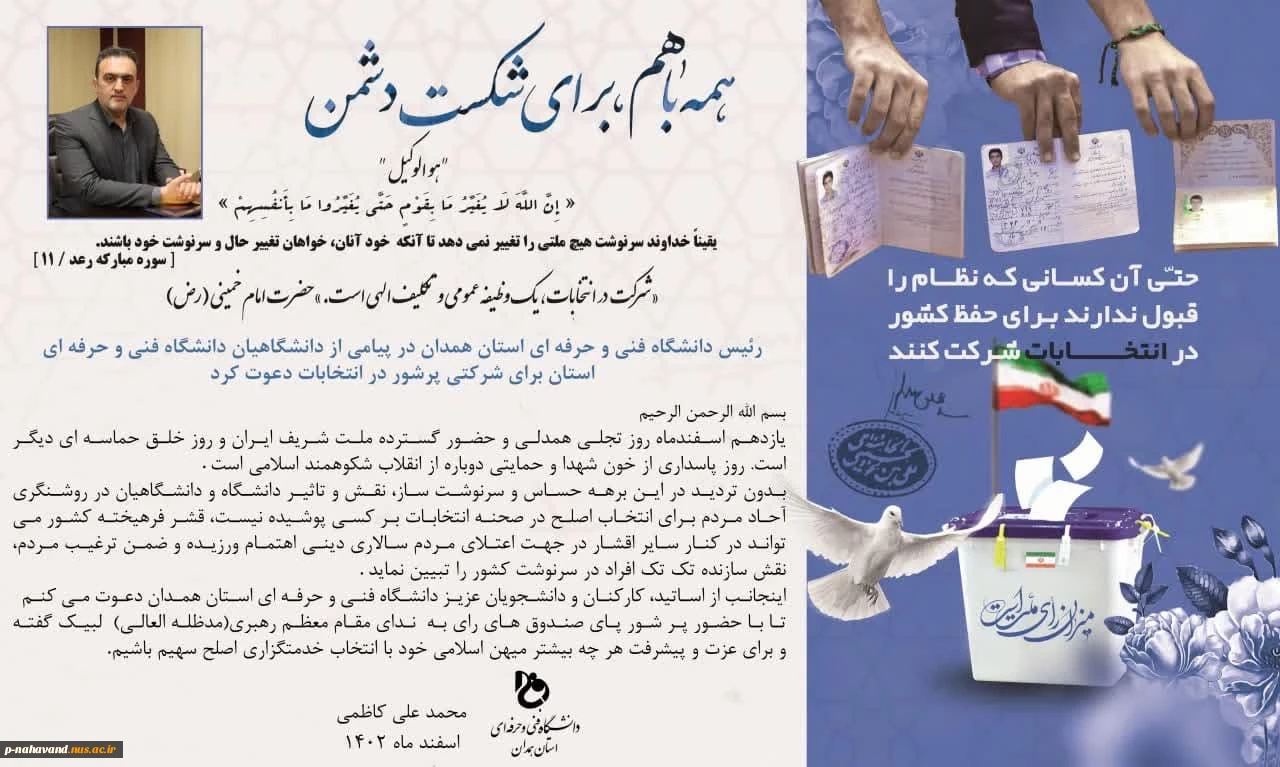 امتیاز دهید : بیانیه دعوت دکتر کاظمی ریاست محترم دانشگاه فنی و حرفه ای استان همدان برای شرکت پرشور در انتخابات 2 دوشنبه 7 اسفند 1402 ساعت 20:57