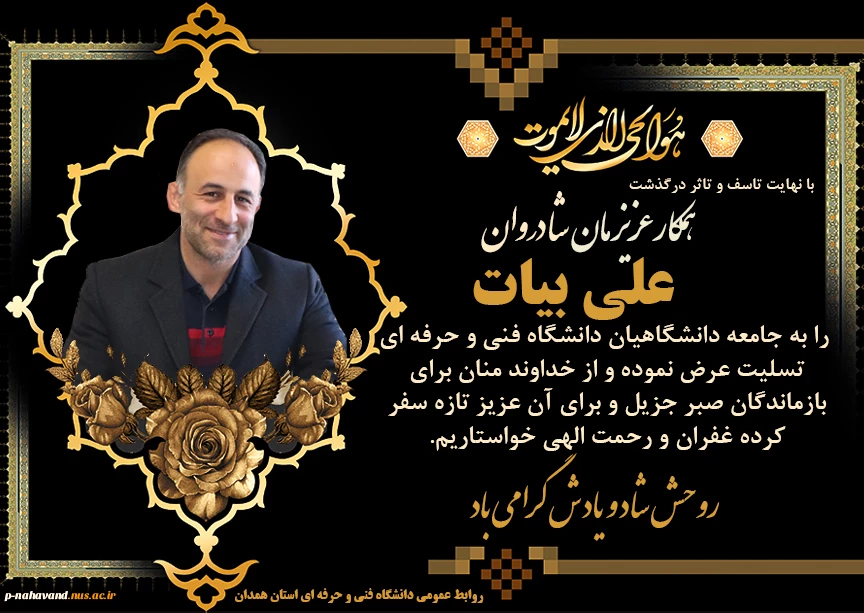 امتیاز دهید : درگذشت همکار عزیزمان جناب آقای علی بیات را تسلیت می گوییم 2 دوشنبه 3 اردیبهشت 1403 ساعت 15:43