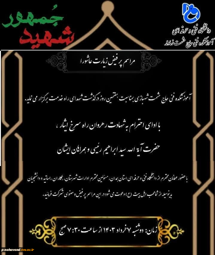 همه دعوتید: به مناسبت هفتمین روز گرامیداشت نام و یاد شهدای راه خدمت، مراسم پرفیض زیارت عاشورا، -هفتم خردادماه ساعت هفت و نیم صبح 2