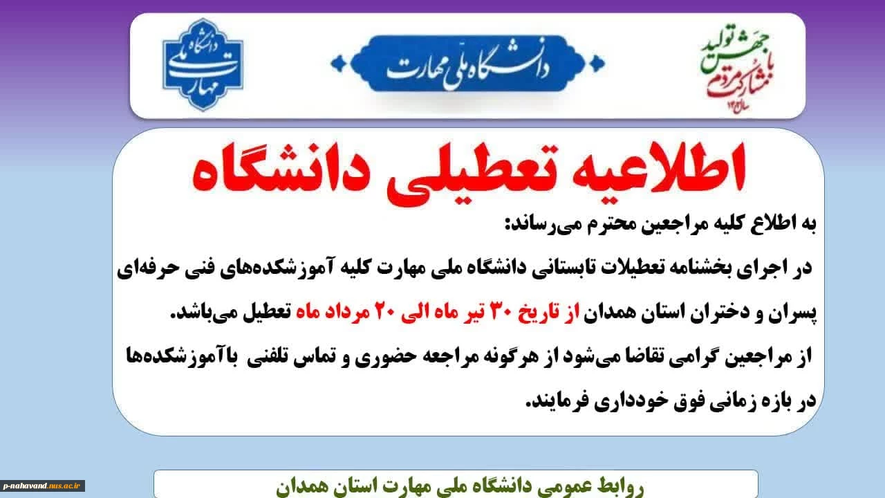 اطلاعیه مهم تعطیلی دانشگاه ملی مهارت 2