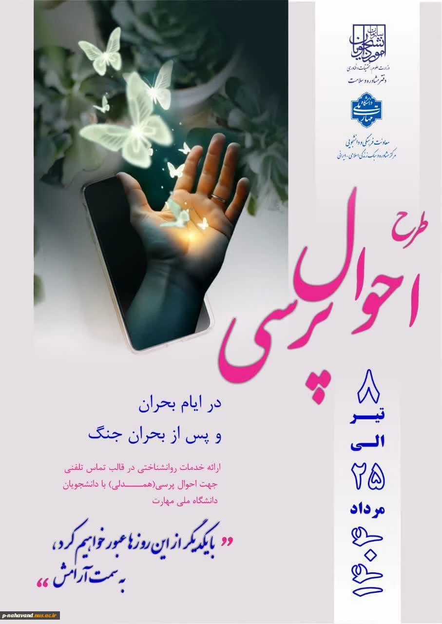 امتیاز دهید : همگام با دانشگاه های سراسر کشور اجرای طرح احوالپرسی از دانشجویان در ایام بحران 3 سهشنبه 31 تیر 1404 ساعت 18:25